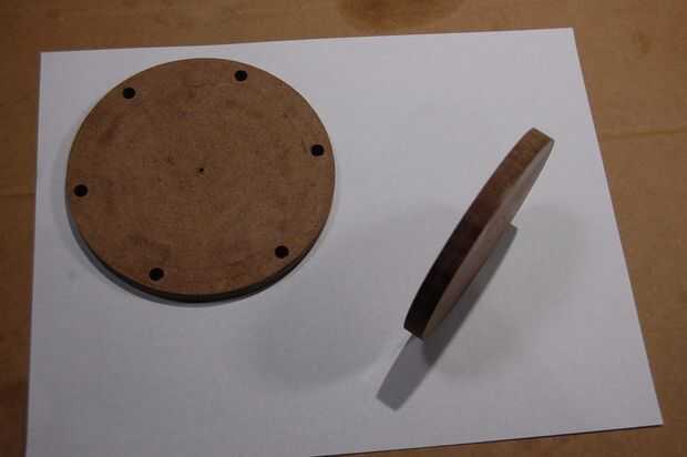 La segunda tarea fue hacer las plantillas. Usé un laminado de dos capas de madera prensada por una capa no era lo suficientemente gruesa como para mis bujes guía. La plantilla de montaña es sólo un círculo dibujado con un compás. La plantilla de superior e inferior también se dibuja con un compás, pero necesitaba seis agujeros alrededor del perímetro. Para esto, redujo la duración de la brújula y dibujó otro círculo... asegurándose de que los discos de 4" cabrían en el espacio interno.