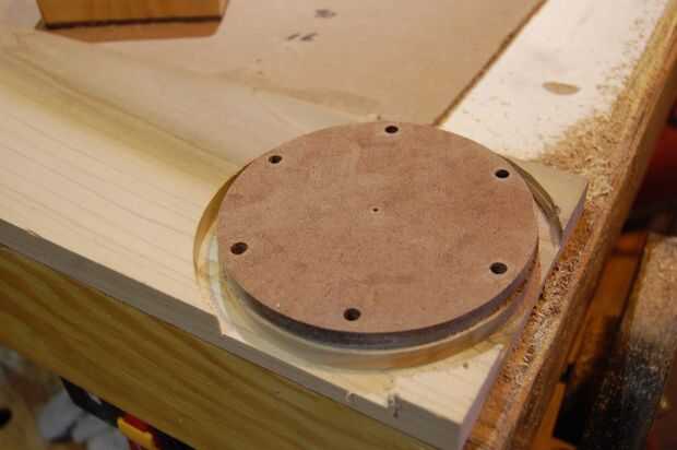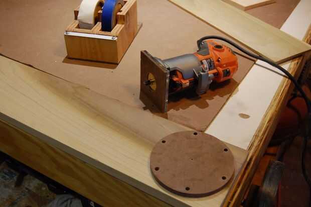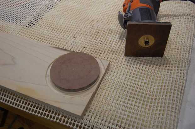 Usar una fresadora con un casquillo de guía, remontar varias veces de estas plantillas para hacer mis discos. Usé cinta de la alfombra a un lado doble fuerte, una almohadilla antideslizante y sujeta la Junta a la mesa de trabajo.