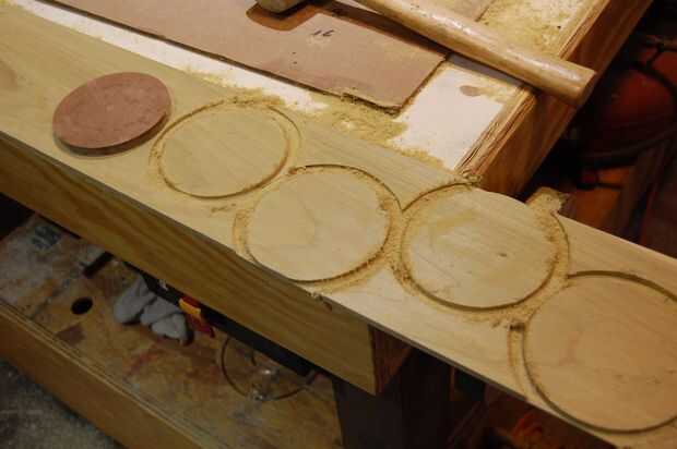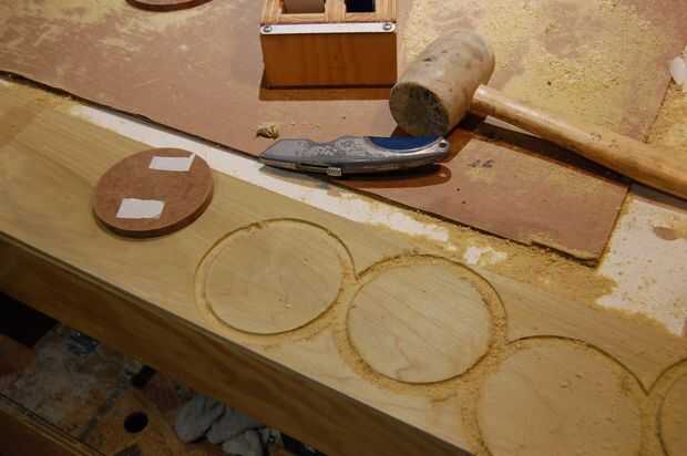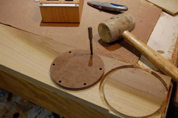 Con los discos más grandes, utilicé a una guía más grande de diámetro buje para conseguir más de un desplazamiento de la plantilla, por lo tanto darme discos de diámetro más grandes. También he marcado los seis agujeros utilizando los 1/4" pieza Forstner y golpes ligeros con un mazo.