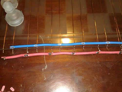Pone uno de los cables a lo largo del borde del tablero de ajedrez con los extremos retorcidos. Hacerla coincidir con los bordes del tablero de ajedrez.