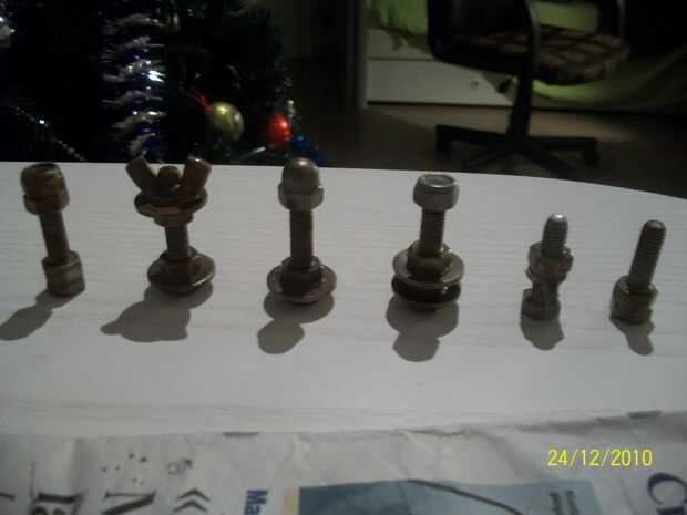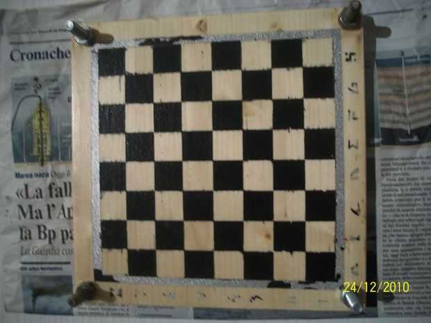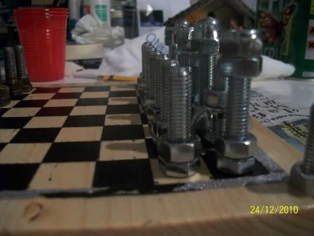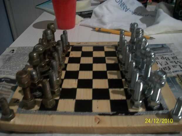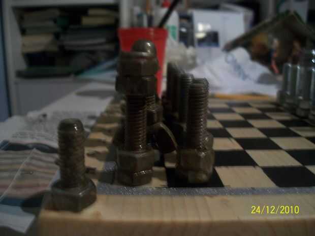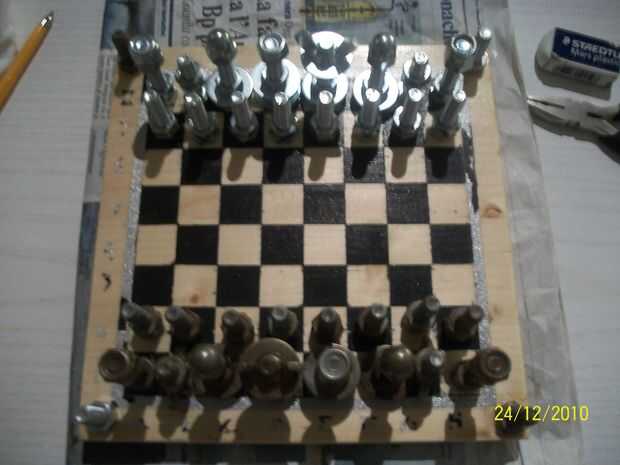 ÉL: por natale ho provato un e construire no un TR me regali por amici miei. Così ho usato alcuni bulloni por creare yo pezzi degli scacchi e del legno semplice por la schacchiera.