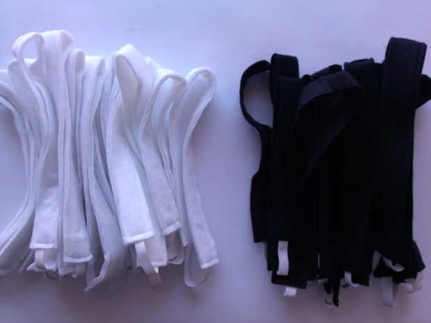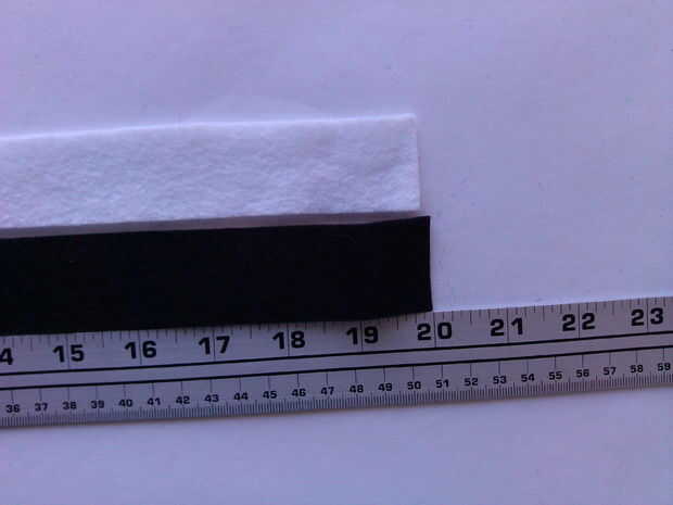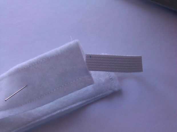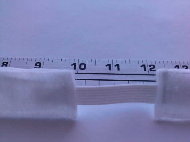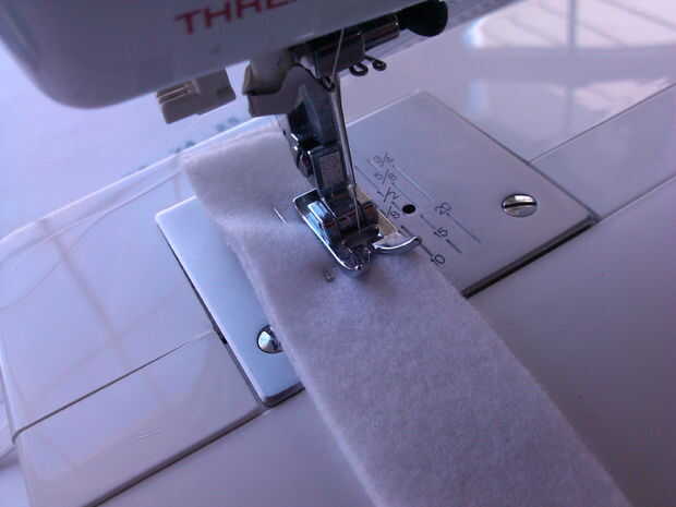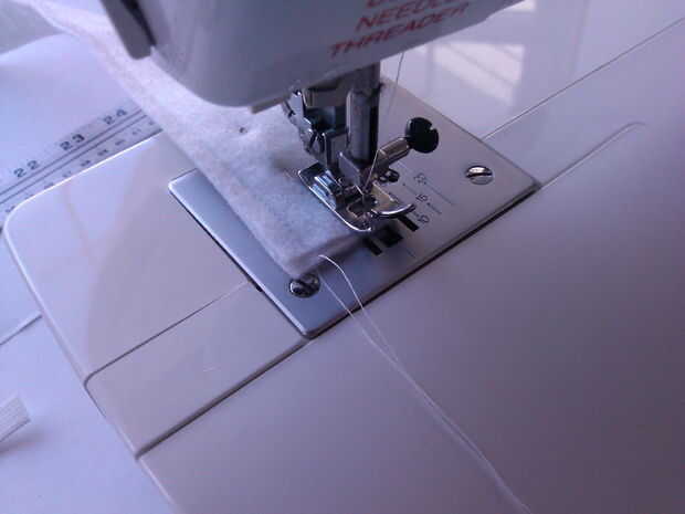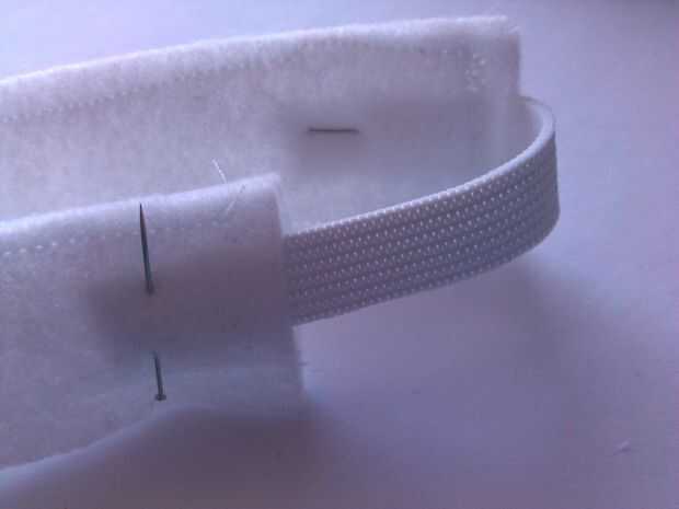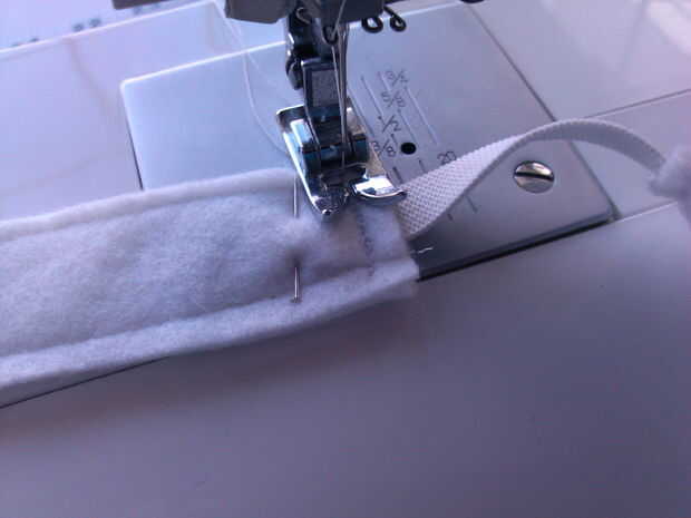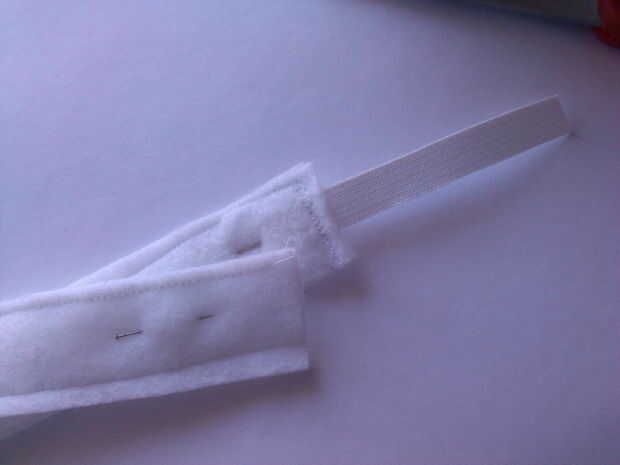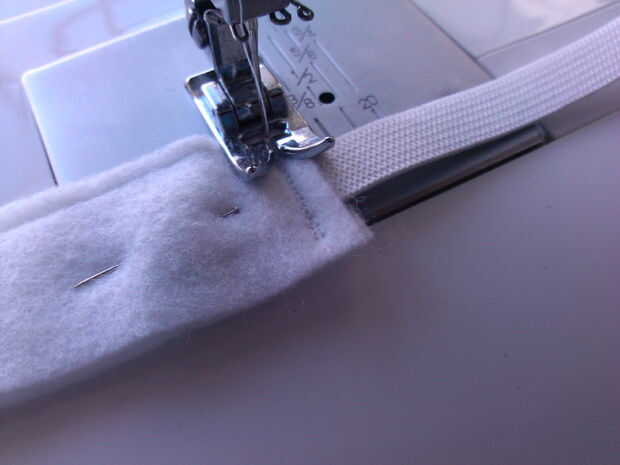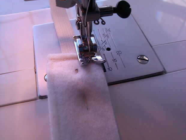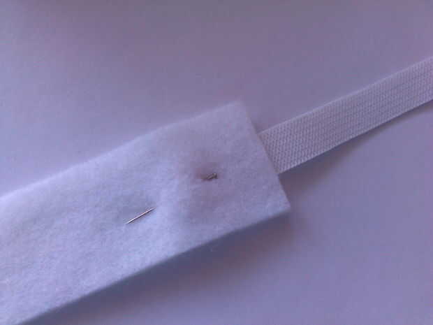 Como se puede ver en algunas de las fotos, cosí el elástico dentro del fieltro hacia adelante y hacia atrás varias veces para mayor seguridad. Salí de dos pulgadas de elástico expuesto de los extremos del fieltro para permitir suficiente estiramiento a una cabeza de adulto como un niño.