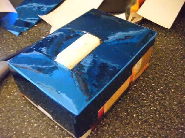 Este poco utilicé papel brillante pegajoso, si no tienes nada de esto, puede pintar, color o cubrir su caja en papel.