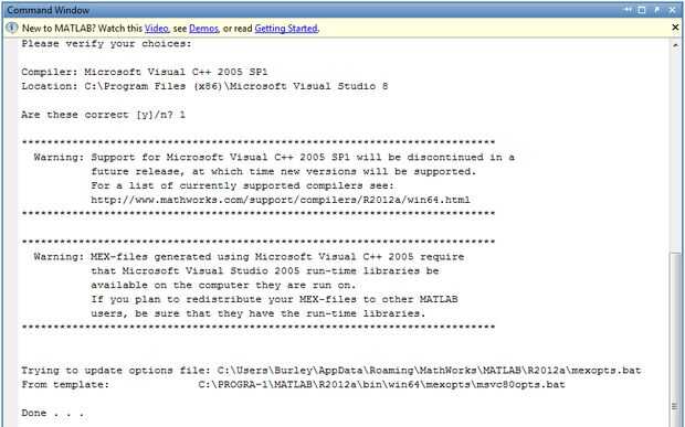 - Tipo mex-setup en el símbolo del sistema de MatLab para seleccionar la configuración de compilador y seleccione Microsoft Visual Studio 2010 Express Edition como el compilador utilizando las instrucciones en pantalla.