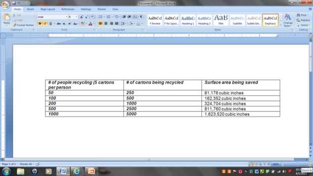La superficie de un cartón de leche de 1/2 galón de leche es 324,704 pulgadas cúbicas. Eso significa que ser despedidos 8,117,600,000 pulgadas cúbicas de plástico cada hora todo el mundo. Si las comunidades y las escuelas todas se involucraron y había reciclado de los cartones de leche, aquí es cuánto nos ahorraríamos.