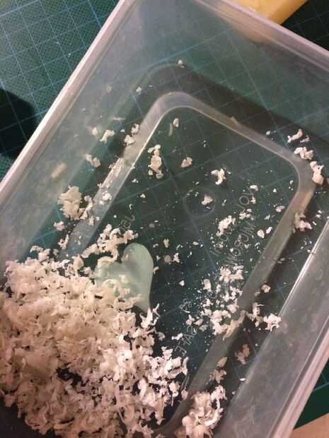 Necesitaremos aproximadamente una cucharada cafetera de cera de abeja rallada (o picado) para mezclar con el aceite portador. Una vez has rallado suficiente cera, ponerlo a un lado por lo que podemos trabajar en el olor.
