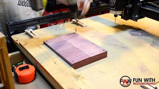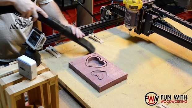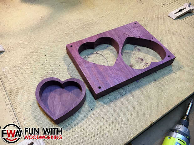 Os adjunto el 1 1/8" pieza y cortar la base. Al configurar el software para cortar la primera bandeja me olvidé de cambiar los ajustes de corte de pino a madera y cortar demasiado rápido y demasiado profundo y había encajado el 1/8" bit que estaba usando. Pude cortar una bandeja en forma de corazón más grande al día siguiente y rescatar esa parte de la madera.