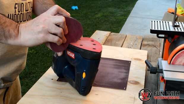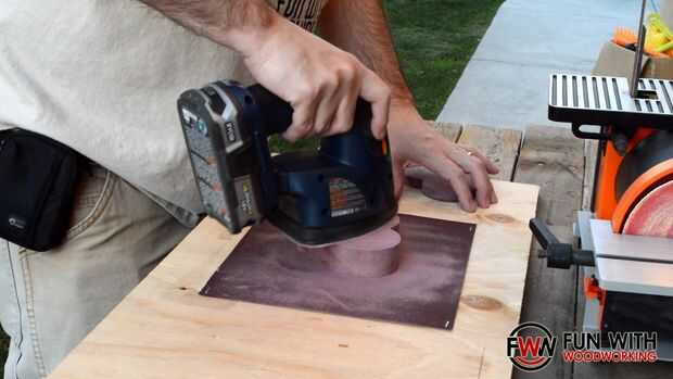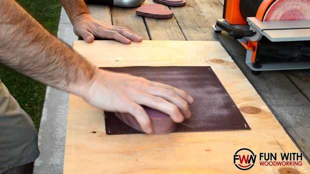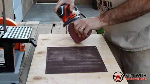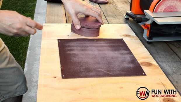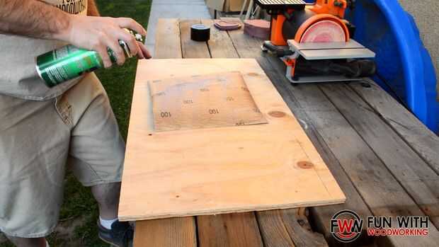 Spray pegado y grapado una hoja de papel de lija de grano 100 a planchas de madera para poder arena la parte inferior de la tapa y la parte superior de la base plana entre sí.