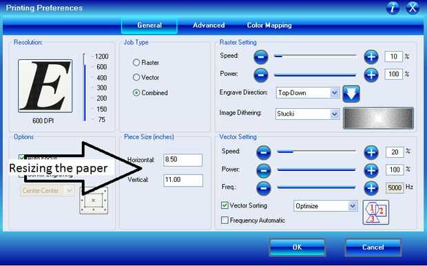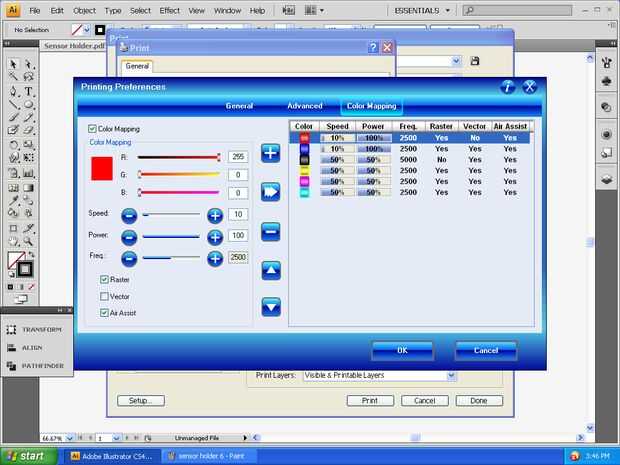 Luego pasar a la ficha de asignación de Color. Desde aquí puede cambiar si un color es para cortar raster o vectoriales. Se muestra a continuación es un esquema de color rojo como trama y negro como el color del vector. Usted tiene que asegurarse de que el cuadro de asignación de color ha sido comprobado por lo que sabe para referirse a las diferentes configuraciones para diferentes colores.