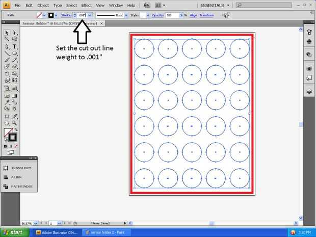 También tendrá el grosor de las líneas de vector que desea cortar juego en 0,001". Se trata de la mejor calidad para el corte de imágenes. Se puede ver en la tercera imagen abajo donde cambiar el espesor. El cuarto imagen muestra lo que parecen las líneas después de ser cambiado a un grosor de 0,001".