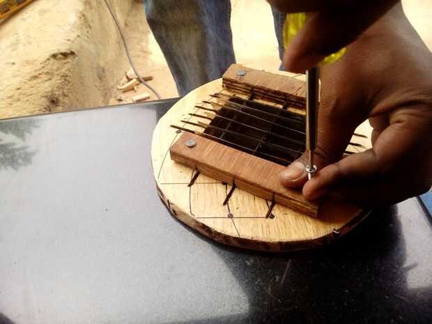 Arreglar las piezas de madera 4 en la pieza base de madera circular con la ayuda de 2 tornillos por pieza.