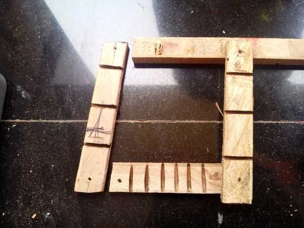 4 trozos pequeños de madera y 2 horizontal y 2 vertical.