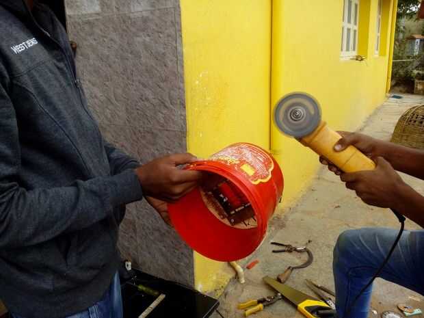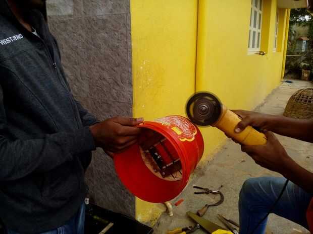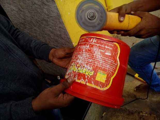 Tomar un recipiente de plástico que tiene el diámetro adecuado para encajar la pieza circular de madera firmemente y corte el extremo del envase plástico como medio circular.