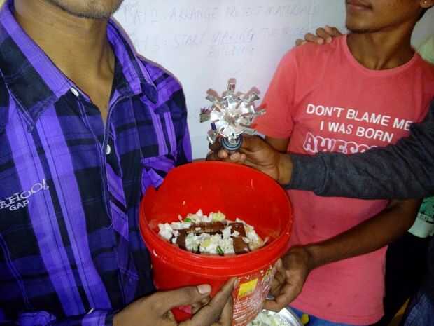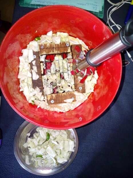 Poner algunas verduras en el lado de la máquina de corte recién hecho y empújelo a través del borde de cuchillo con una gran herramienta de cuchara o smasher.