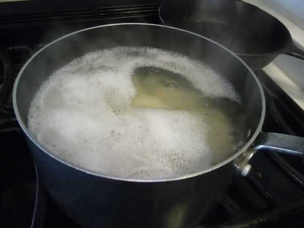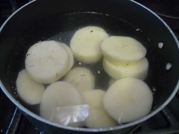 Colocar rodajas de patatas en una cacerola mediana. Cubrir completamente con agua. Añadir 1 cucharadita de sal. Llevar a ebullición sobre alto calor. Reduzca el calor para baja, cubrir y cocinar a fuego lento 10-15 minutos o hasta que horquilla blanda. No cometas el error de sobre-hervir tus papas hasta que son papilla.