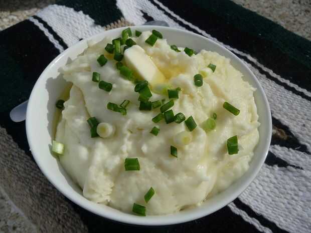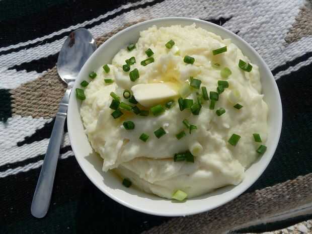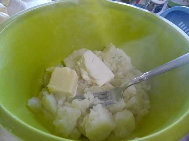 O: Cuchara luego en un recipiente de vidrio servir, cubra con envoltura plástica y reservamos hasta la hora de la cena (como lo hago a menudo). No hay necesidad para refrigerar estas patatas puré si se sirven el mismo día.