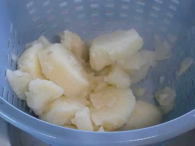 Escurrir papas en un colador, lo que les permite sentarse por lo menos 2 minutos para drenar totalmente.
