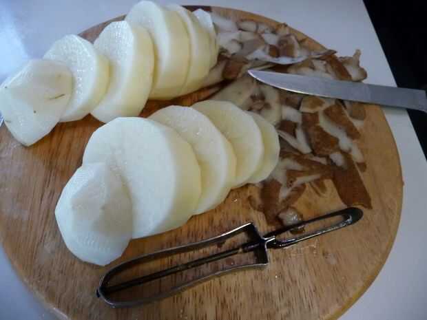 Pelar las patatas y cortar 1" rodajas gruesas.