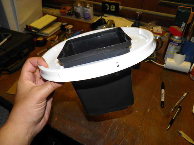 elegí un DWC o diseño de sistemas de cultivo de aguas profundas debido a su sencilla configuración y pocas piezas. Un sistema básico de DWC utiliza un recipiente de agua, una olla plantación que está sumergido en el agua/nutrientes, y una bomba de aire colocados en el agua a las raíces con el oxígeno. El primer paso para construir el depósito de agua es trace el contorno de pote de 5" en el centro de la tapa de un cubo de 2 galones. Luego reducir las dimensiones por aproximadamente 1/4" por lo que el bote se sentaría muy bien en el agujero que se cortará. Utilicé una herramienta Dremel para cortar el agujero y luego frotar alcohol y una toalla de papel para eliminar cualquier marcador de sobra. Luego perfore un agujero de 1/4" en la tapa de la manguera de aire. Luego perforé doce agujeros de 1/2" a cada lado usando un patrón cuadriculado dibujado raspando con un cuchillo en el plástico. Usted puede ser capaz de by-pass este si puede encontrar una tapa de olla red 2 galones, pero tenía la olla cuadrada poniendo alrededor.
