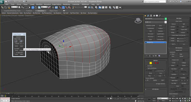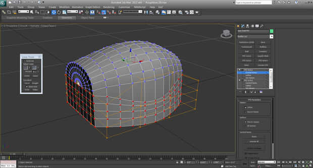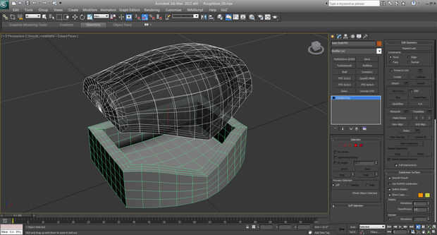 Necesitaba preparar para separar la tapa de la parte inferior. Quería que la tapa cónica a un punto en el frente, así que selecciona los vértices de la parte inferior de la mitad de la caja y realiza una serie de deformaciones de FFD hasta que me dieron la forma que me ha gustado. Utilicé los comandos espacio y Relax a mis bucles de borde. Luego seleccioné los polígonos que quise conforman la tapa y había separado como su propio objeto. Entonces apliqué el modificador Shell a ambas partes para que ambos se convertiría en piezas con geometría interior y exterior con anchura.