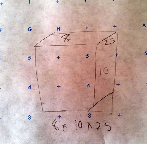 Hice unas matemáticas muy simples y averiguaron que mi rectángulo debe tener 13" por 15" para terminar con un área interior que es aproximadamente 8" por 10" con una altura de 2.5".