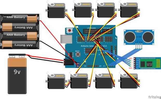 A continuación, conecte los 8 servos a cualquiera de los pines respectivos servos en el escudo. Recuerde tomar nota de los pernos que se utilizar ya que tendrá que definir en el sketch de Arduino.