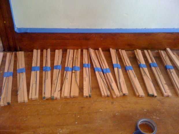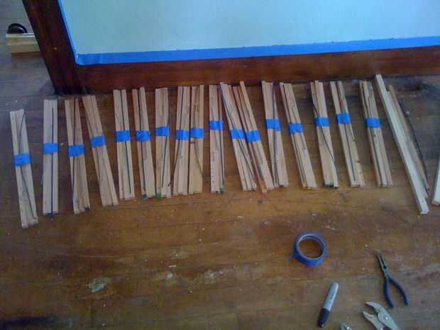 Corte el pescado cinta en 18" segmentos fue duro con las pinzas. También podría agarrarlos con el vice apretones y curva hacia atrás y hacia adelante hasta que encajen. Yo también acurrucado el 1/4 de los extremos, por lo que la bandera sería detenido por las grapas y no se sacó.