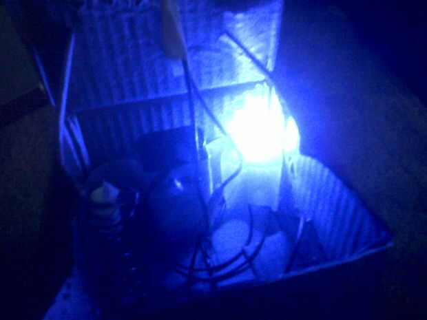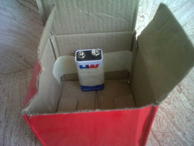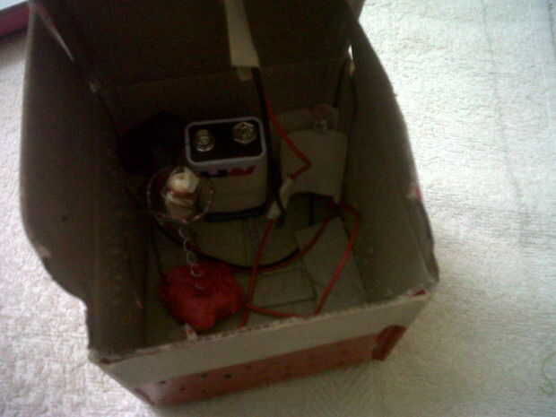 En primer lugar, montar la batería en un lugar con cinta adhesiva. Ahora del enchufe, conecte el primer LED hasta el borde de la caja. desde el led, mantener sugru o plastilina en el otro borde de la manera que el talón está dentro del círculo pero sin tocarla. a partir de ahí, conectar el segundo LED en el techo del cubo, donde se puede ver por encima. ahora lo conecte a la batería y prueba ya que está funcionando todo.