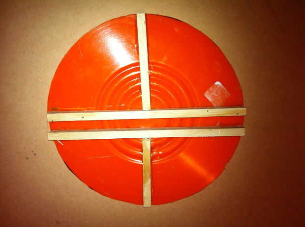La distancia entre los dos palos paralelos es el mismo que el grosor de las patas de la araña (los bloques pequeños de madera contrachapada). Esto es importante porque pegué algunos pedacitos de gancho de alambre en los laterales que impiden el cono gira dentro de la araña. Por favor vea el siguiente paso para que esto sea más claro.