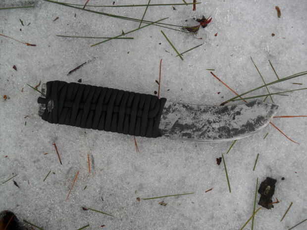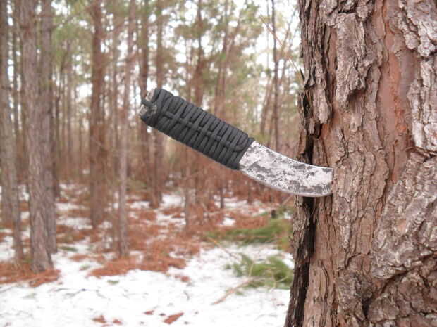 después de ver muchos videos en Youtube sobre cómo hacer un cuchillo decidió darle un ir. Construí este cuchillo usando sólo herramientas de mano. El primer problema que enfrentó fue encontrar los materiales para construir el cuchillo con. Entonces encontré una vieja hoja de cortacésped en el garaje. Nunca había escuchado de alguien que hace un cuchillo de una hoja de cortacésped, pero iba a tratar. Primero corté una pieza de la cuchilla de la podadora cerca de 8 pulgadas de largo. Esta pieza era cuadrada con una punta triangular simple. Entonces construí un fuego en una parrilla muy viejo. Esto fue la divertida parte. Usando trozos de madera no tratadas había construido un fuego en la parrilla y utiliza un ventilador para conseguir quemar aún más. Después de que el metal era rojo caliente sacó el cuchillo y forjado en la parte plana de mi vicio. Luego utiliza un archivo antiguo para darle un borde y acabó sobre mi piedra mojada. Originalmente iba a salir el mango llano, pero terminó envolviéndola en paracord.