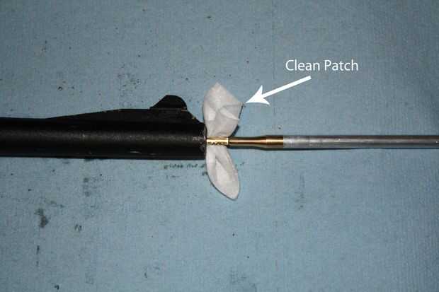 A continuación retirar el cepillo de alesaje y coloque el parche y añadir un parche de limpieza. Spary una pequeña cantidad de romper gratis en el parche y ejecutar a través de la barrle en la misma dirección que funcionó el cepillo de alesaje una vez que ha ejecutado el parche de abajo la barrle quitar y tire de la varilla. Me reapeat este paso al menos tres veces con un parche "húmedo". NCE ha ejecutado los parches mojados por el cañón colocar parches limpios y secos en la punta de parche y ejecutar propia del cañón hasta que el parche pasa a través del cañón y salir totalmente limpio.