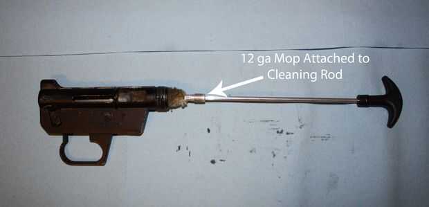 Después de que el receptor se desnuda comenzar uniendo el.12 ga "fregona" en la manija de la varilla de limpieza y rociar una pequeña cantidad de la rotura libre en la "fregona". Con un movimiento giratorio ejecute la "fregona" en el receptor asegurándose de limpiar toda la longitud del tubo receptor. A continuación, utilice uno de las toallas para limpiar cualquier exceso de la rotura libre del receptor.