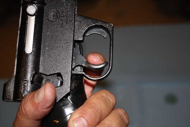Tomar el arma en seguro, aún apuntando en una dirección segura y el gatillo, usted debe oír el martillo caer. Manteniendo el gatillo completamente hacia atrás, con su otra mano tire la palanca de carga hacia atrás completamente y suéltelo.
