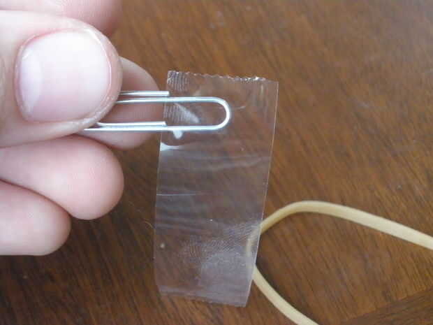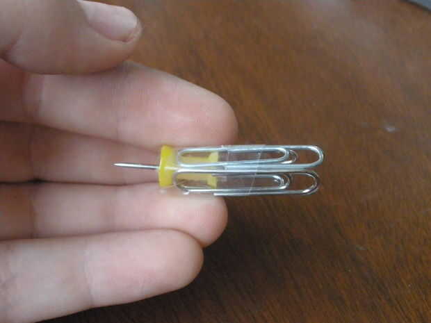 Ahora toma la cinta con el clip solo en él y cinta adhesiva a la bordada. Empezar a añadir los otros clips a la tachuela mientras grabar abajo. Cerca del final de la misma verá que debe parecerse a la imagen.
