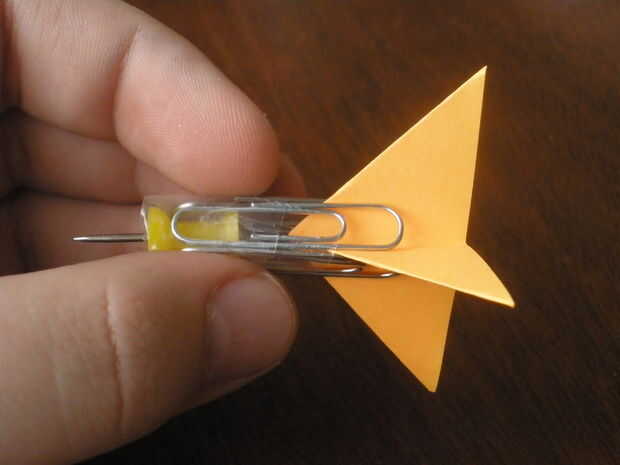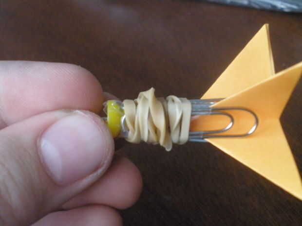 Coge la goma y Envuélvala alrededor de la cabeza y el "eje" del dardo.