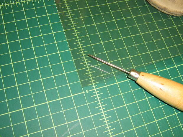 Perforar a lo largo de la tapa usando un punzón o una aguja cada 1/4" o algo así. La perforación hace la costura en la cinta mucho más fácil y más regular. No hacer las perforaciones demasiado juntos o demasiado cerca del borde, para no romper el plástico a través de.