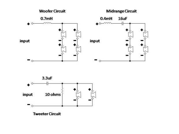 Rango medio circuito: quitar 0.4mH inductor, condensador de 16uF cambio a 12uF, insertar 3.0mH inductor en paralelo con la Asamblea de rango medio