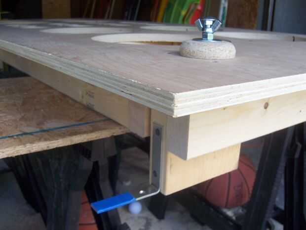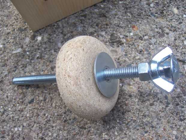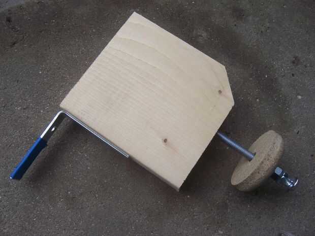 La sección de "frente" es un 7" largo 3/8" tornillo de carrocería con una tuerca mariposa joden completamente apretadas contra la cabeza y una contratuerca Bloqueo en su lugar. Esto puede ser sustituido por cualquier tipo de elemento de sujeción tipo tornillo de pulgar, pero tuve problemas para encontrar una opción de una sola pieza que fue esta longitud y el diámetro. Luego usé una arandela guardabarros de 1.5" de diámetro y 3" de diámetro por 3/4 tablero de partícula gruesa "lavadora" para cubrir completamente la ranura en posición.