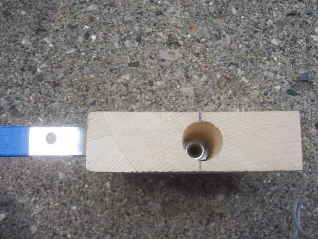 La sección "back" es 6" pieza larga de 2 x 6 con 3.5" L-soporte atornilladas a él. Usé cinta de pintor azul envuelto varias veces alrededor del extremo de la abrazadera para proteger el guarnecido de la puerta cuando el soporte se tira contra él. Taladré un agujero de diámetro 1" 4"en el final de la 2 x 6 y perforado 1/2" agujero a través de las 2 restantes". Luego instalé un 3/8" tornillo en el agujero profundo de 4". Esto permite que el perno de carruaje llegar a la T-nut sólo 2" en la Asamblea.