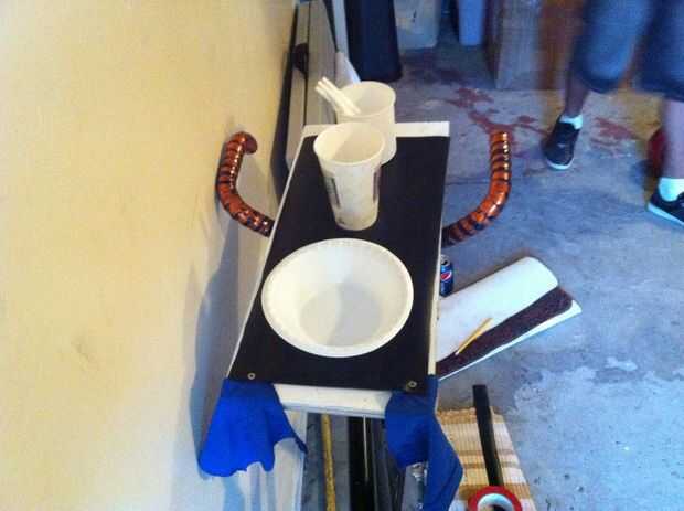 Siempre estaba cansado de saltarse el desayuno porque me desperté demasiado tarde y tuvieron que montar en mi bicicleta a la escuela. Esto dio lugar a caer dormido en clase y no prestar atención al profesor. Así que hablé con mi amigo y se nos ocurrió con el desayuno en el camino, una nueva forma innovadora de tomar su desayuno en su bici y sacar a la escuela, al mismo tiempo! Nuestro diseño hace espacio para un tazón de cereal, una taza para el jugo, trapos para limpiar cada mano y un recipiente para utensilios y otros elementos que no desea llevar en el bolsillo.