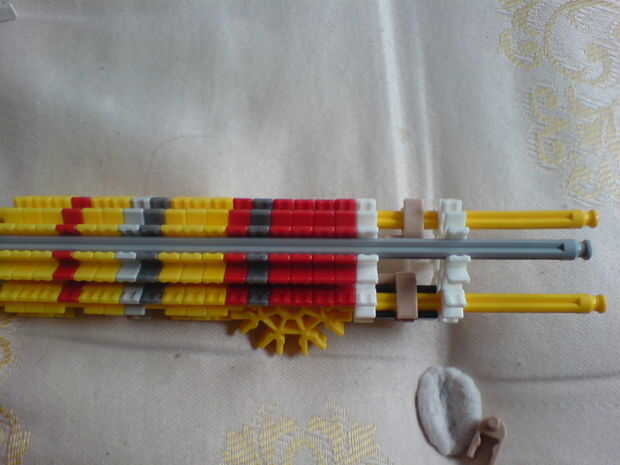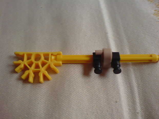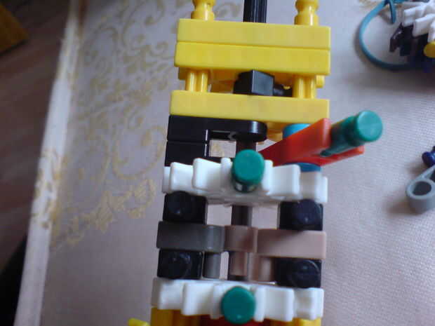3. otra vez un poco complicado. ignorar el negro barra (percutor) añadir un espaciador azul a una varilla. Añadir un conector naranja con una barra verde adjuntas a ella. Añadir a otro separador.