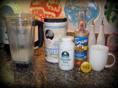 1 cucharadita redondeada polvo de cáscara de Psyllium. Esto actúa como un agente espesante y mantiene al batido de separar. La fibra añadida le impide sentir hambre durante su entrenamiento.