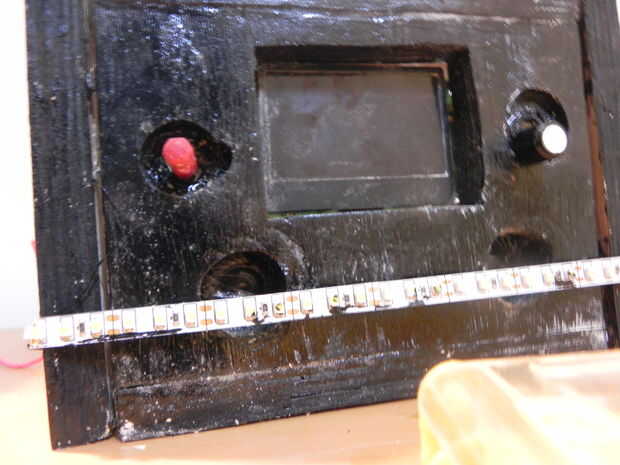 Opcional: Si tienes el color de la GLCD ajuste de potenciómetros, sujete a uno de los lados como se muestra en la imagen. Si tienes la tira llevada, hacer un agujero para poner a través y pegarse a las paredes con tanto doble cara cinta adhesiva o pegamento caliente. Hacer un agujero para el cable de alimentación de y conecte a un enchufe. Una vez que haya terminado, se realiza el proyecto. Por fin tienes una buena manera de despertar!