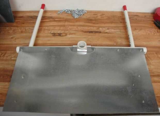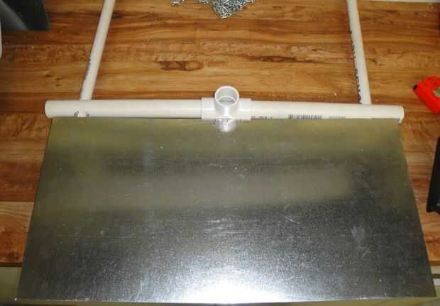 Tome la chapa y cortar una muesca según la foto y el tornillo en la cabecera de 1" y ½" tubos de soporte con tornillos de 10. Medir de la derecha 11 1/8 pulgadas y a 12 7/8 pulgadas. Marque estas mediciones. Medida 1 pulgada en como se ve en la foto.  Corte con la línea de tijeras los dos láminas de metal.  Doblar la pieza cortada a 90 grados.