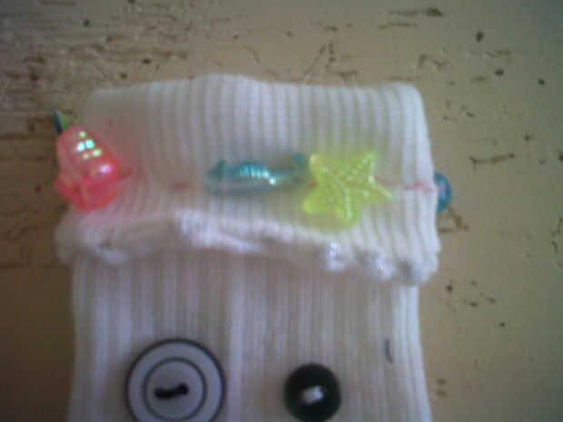 Paso 3 : luego, cierre la tapa del calcetín (la otra apertura del calcetín) con una aguja, hilo y perlas. Podría ser la corona o el peinado de su monstruo.