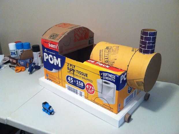 A continuación, mi esposo me consiguió un tubo de 8" construcción de mi almacén local del hardware. Cortarlo para dar forma al frente de Tomás y sujeté con pegamento caliente. Él también corta en su totalidad en la parte superior del tubo con una sierra entera, creo que se llama, para fijar la chimenea. Lo hice así para que el caramelo se baja la pila y recoger en el compartimiento delantero de Thomas. Si te fijas bien verás que utilicé bloque cilíndrico de juguete de mi hija por la chimenea. Tal vez que ella no lo notará. También corté encima de un tubo de toalla de papel para crear los topes en el frente que le concedo dos círculos cortar utilizando el tablero de la espuma. Usted verá estos más adelante.