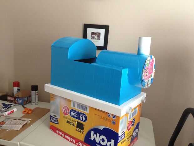 mi hijo le encanta Thomas y todos sus amigos de tren motor. Así para un desfile de disfraces en la escuela, me puse a hacerle un Thomas el traje del motor del tanque.Paso 1: Encontrar un cuerpo de tren empecé con una caja vacía de Pampers Cruisers ta