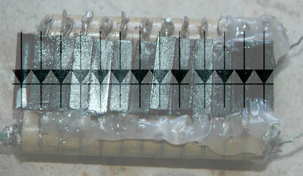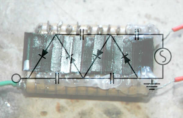 El voltaje utilizado en el dispositivo multiplicador es sólo una extensión del esquema anterior, donde cada pila condensador es una "cara" del multiplicador. Pero debido a la inusual disposición y tamaño de los diodos (Nota allí son diodos en ambos lados de la pila de condensador), la configuración correcta de los diodos de soldadura puede ser complicado. Lamentablemente construido este multiplicador hace algún tiempo y no tengo fotos del paso a paso, pero intentará mi mejor para explicarlo!