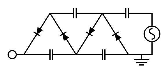 Nota: los extremos de la pila de condensador tienen configuraciones ligeramente diferentes entre sí. La entrada del multiplicador de voltaje en la pila de un condensador, está conectada a uno de los extremos de un condensador que no tiene ningún diodo. En la salida, un lado tiene dos diodos conectados a uno de sus pines y no condensador junto a él. Es importante que usted consigue esta configuración correcta.