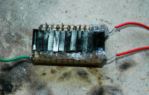 Una vez que la pila de multiplicador del voltaje es acabada puede conectar los dos cables de entrada y salidos - el etiquetado GND es un terminal de entrada y salido por lo que usted necesita soldar dos cables aquí (el cable de salida se conectará a una placa de metal en su zapato y tendrá que ser extra larga - ver paso 5).